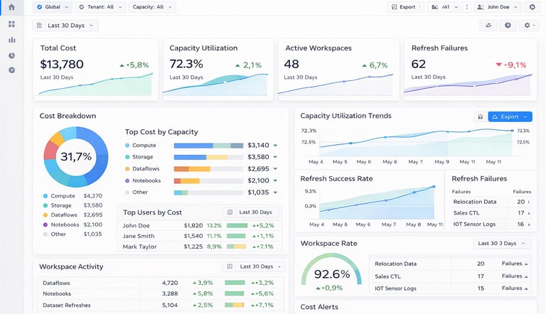 Our Fabric Cost & Governance Monitor helps organizations control spending, improve transparency, and establish clear governance in Microsoft Fabric. The solution provides structured monitoring for capacity usage, workspace activity, refresh behavior, and cost-relevant patterns. By making inefficiencies visible early, businesses can reduce waste, strengthen governance, and operate their data platform with greater confidence and predictability.