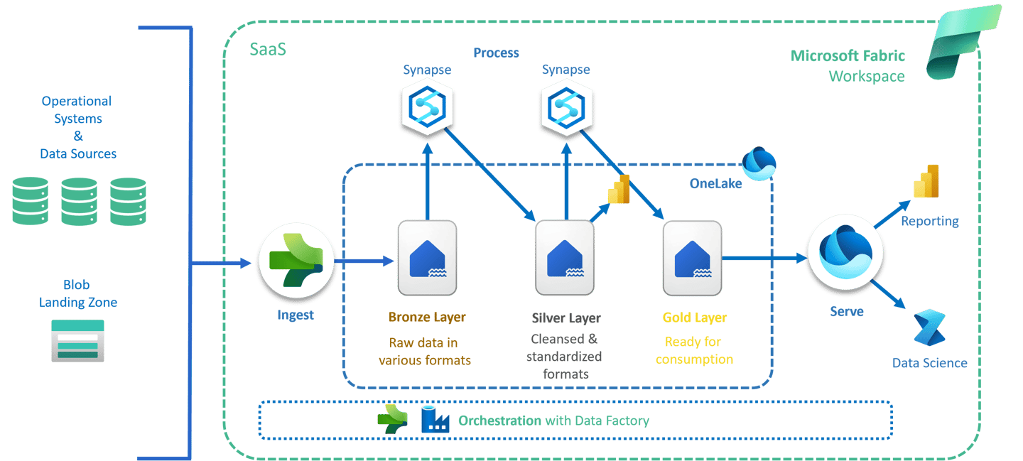 Fabric incorporates Data Factory for data integration and Synapse Data Engineering for large-scale processing. This means ETL pipelines, big data transformation, and advanced modeling all happen in one platform.